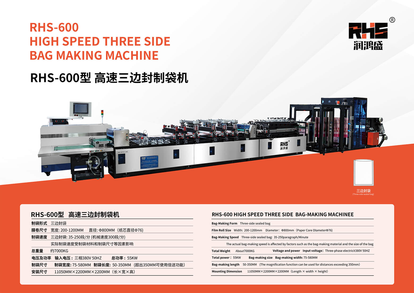 Three-side sealed bag: 35-250paragraph/MinuteThe actual bag-making speed is affected by factors such as the bag-making material and the size of the bag