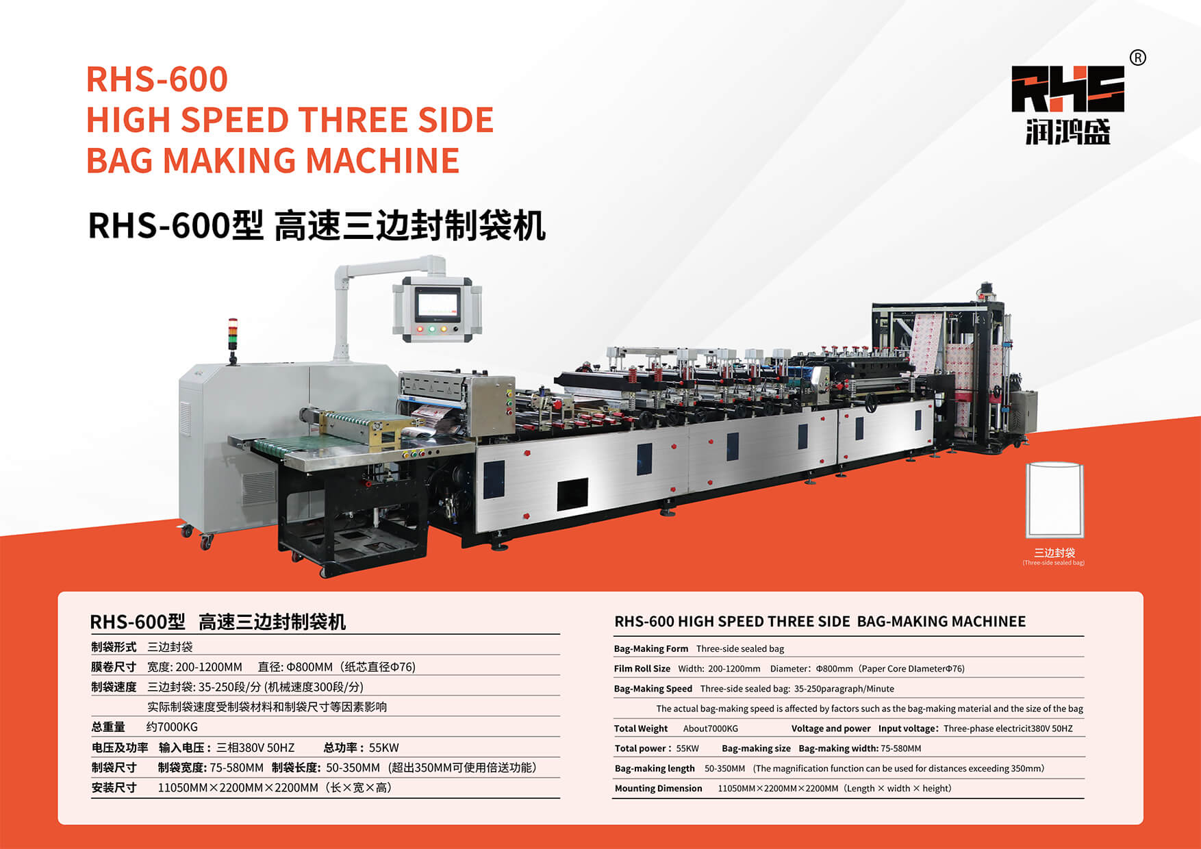 Three-side sealed bag: 35-250paragraph/MinuteThe actual bag-making speed is affected by factors such as the bag-making material and the size of the bag